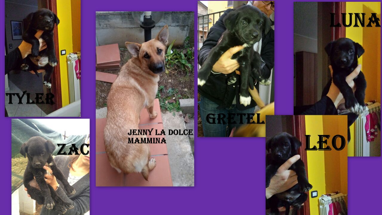 Lei taglia medio grade, circa 20 kg, dolcissima. I piccoli probabilmente più piccoli di lei. Circa due mesi. Giocherelloni. Nati in una siepe. Li abbiamo raccolti e ora sono in canile.