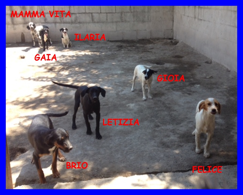 Un'intera famiglia dietro le sbarre. Una storia di incuria e menefreghismo come mille altre. Una cagnolina incinta che è diventata di troppo e chissà quanti cuccioli che nasceranno e che non si sa dove mettere...quindi è meglio correre ai ripari prima che vengano sfornati. Così si mette in macchina la malcapitata e si scarica lontano da casa..e chi si è visto si è visto!!! Lei che viene accalappiata e rinchiusa in canile e dopo un pò...ecccoli là...MAMMA VITA, (non potevamo che darle questo nome), mette al mondo 6 meraviglie, 4 femminucce e 2 maschietti, ai quali abbiamo voluto dare dei nomi beneauguranti: BRIO, FELICE, GAIA, LETIZIA, GIOIA e ILARIA. e che oggi hanno già 4 mesi, futura taglia media, come la madre. Nati in canile, hanno la loro mamma che li coccola, li protegge e li accudisce e sono tutti insieme...la loro famigliola è tutto il loro mondo, al momento bastano a loro stessi. Ma noi sappiamo che non possono crescere in un box, senza conoscere la vita vera, quindi cerchiamo per ognuno di loro, m