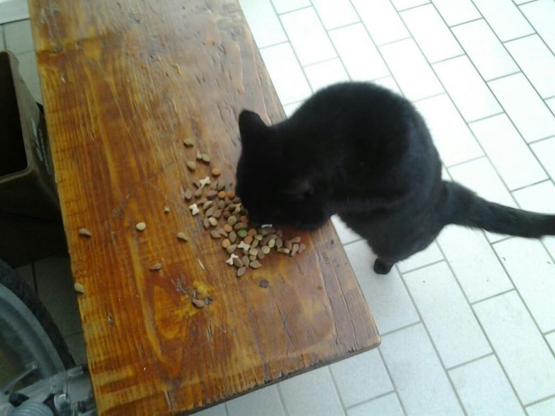 Luna che mangia le crocchette dalla panca