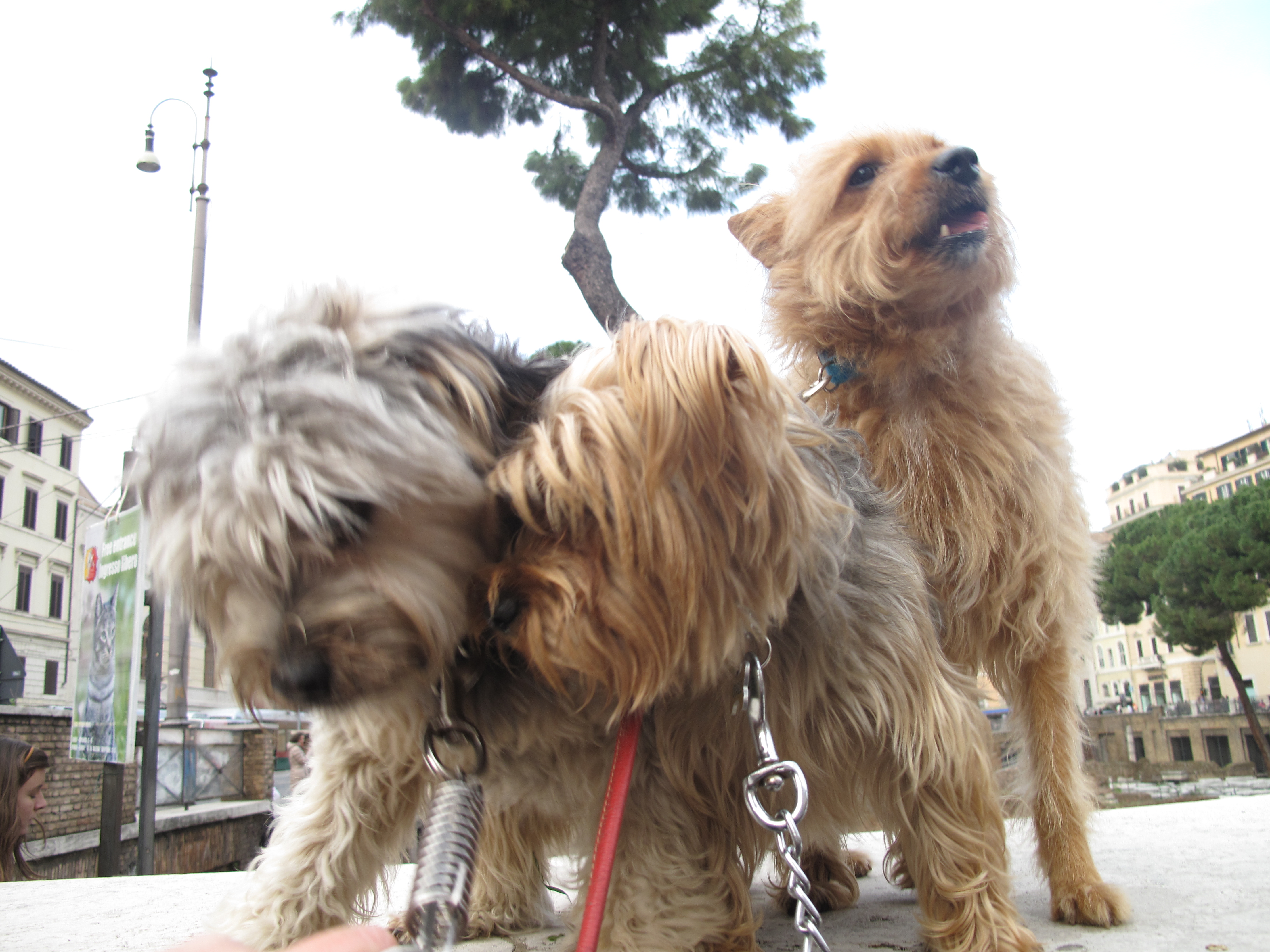 Fiamma,come sempre,cerca di prevalere su Charlie.In questo caso il motivo della disputa è chi deve stare in mezzo durante una passeggiata mentre Trilly gli guarda un po' annoiata.
