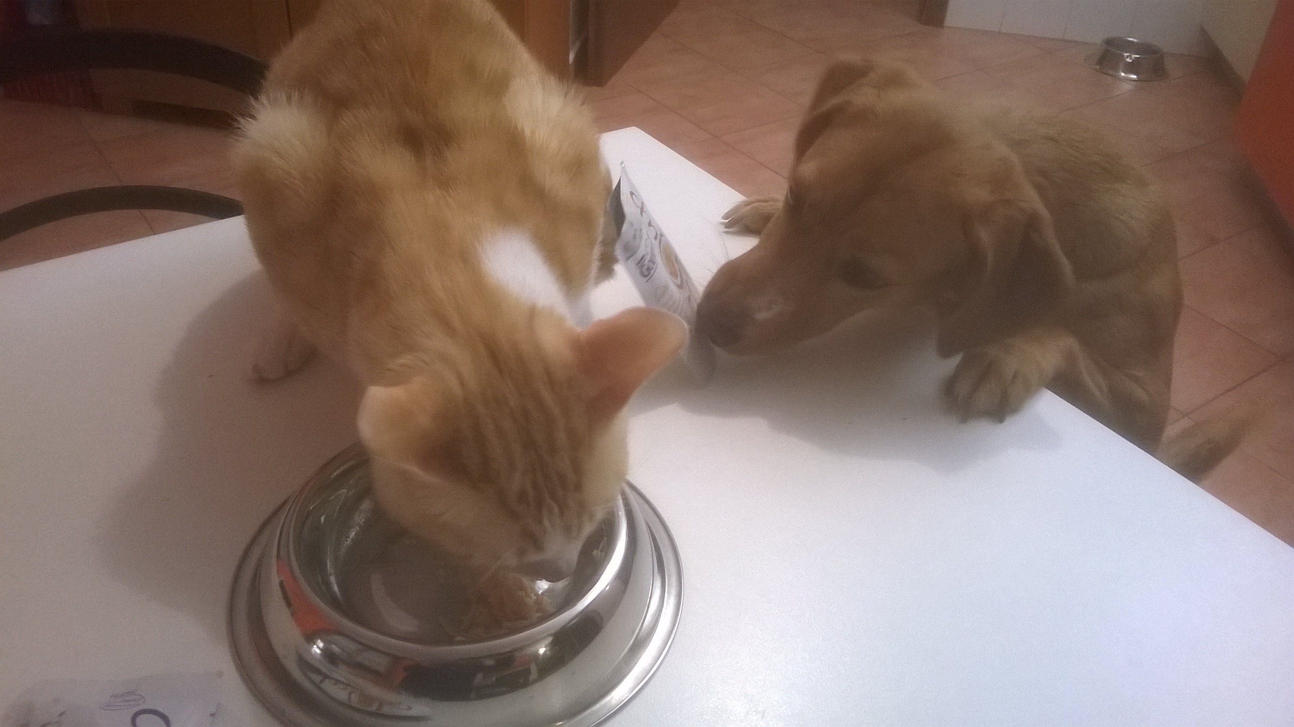Mi sembra di vedere i miei pelosetti... Il mio gatto Leo che mangia; e sotto il mio cane Teo che aspetta che schizzi via qualche pezzetto :-D
