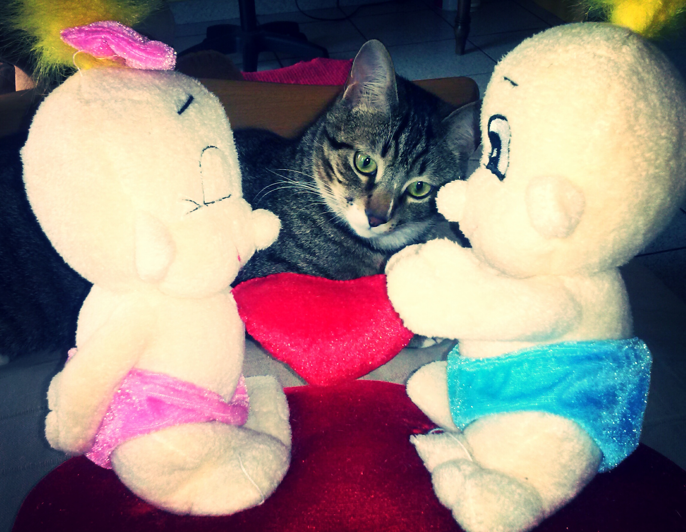 Descrizioneil mio gatto adora questi due pupazzi...anche se non ha ancora capito cosa stanno facendo...