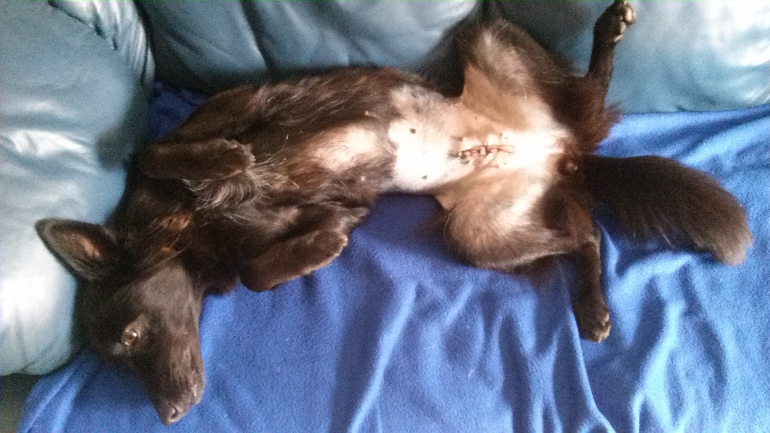 abbiamo sterilizzato Litsa,mi si spezza il cuore vedere quel taglio,ma la sua dolcezza unica mi fa sorridere tra le lacrime.Questa e' la sua posizione da coccolamento!