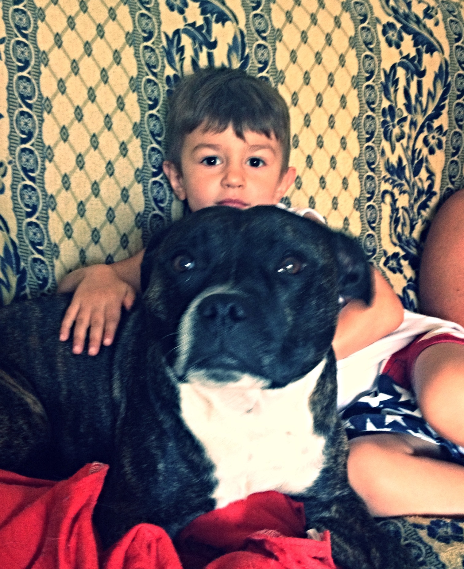 Descrizionemio figlio Elio con Lola, una dolcissima stafforshire bull terrier