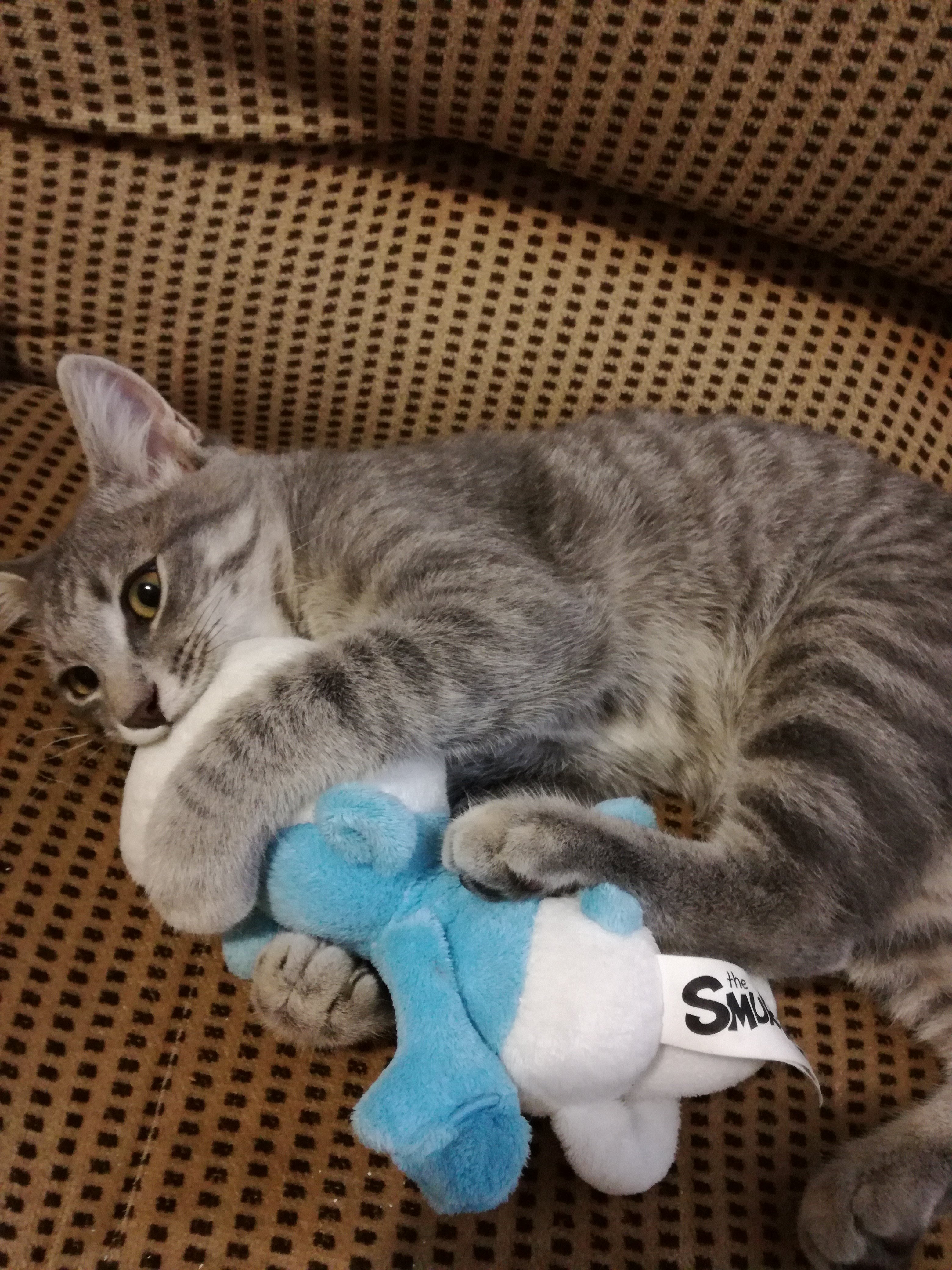 Al mio micio piace giocare con i peluches di mio figlio