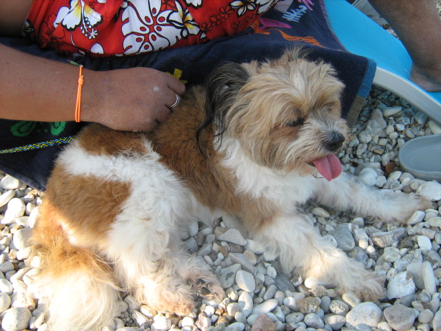 DescrizioneTrudy è in spiaggia insieme a me e mio marito (che la sta accarezzando) a Lefkada (in Grecia). La portiamo sempre in vacanza con noi e lei ne è felice