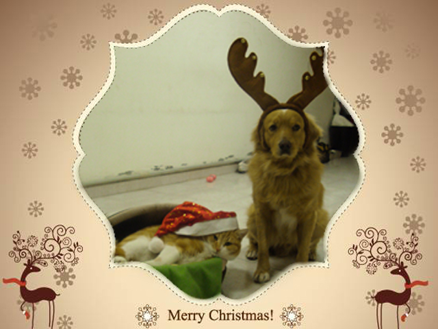 Tanti auguri e buone feste da gatto Rudy e cane/renna Ronney