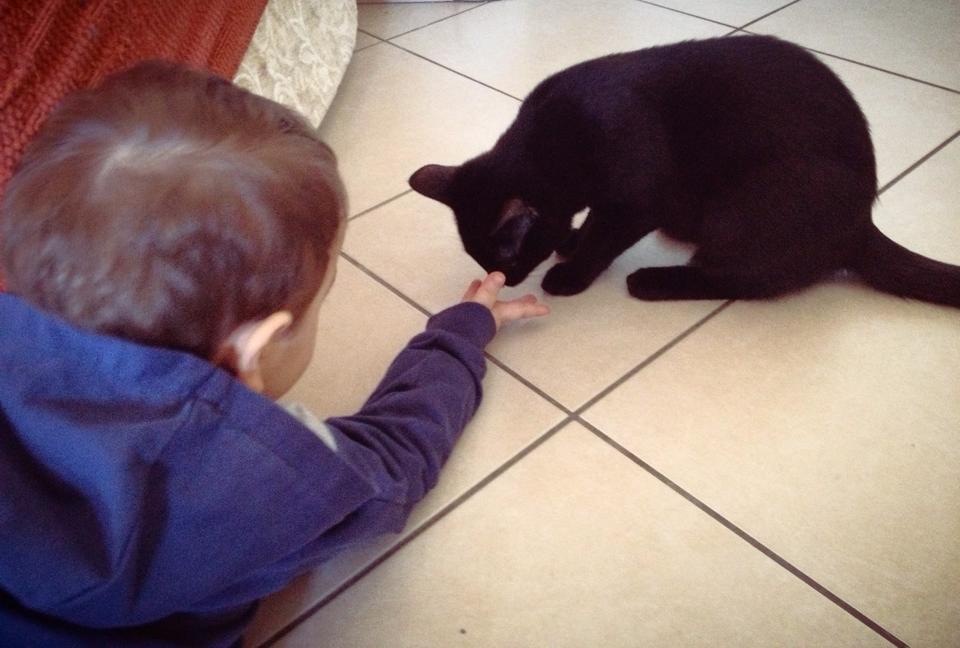 Descrizionemio nipote che fa conoscenza con la mia micetta Poggie